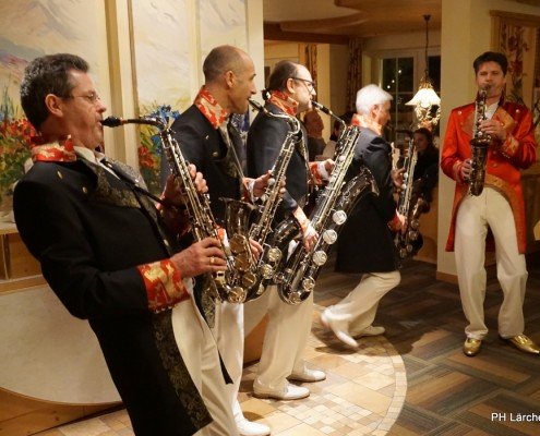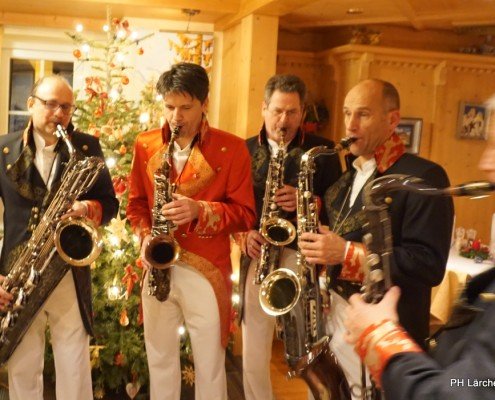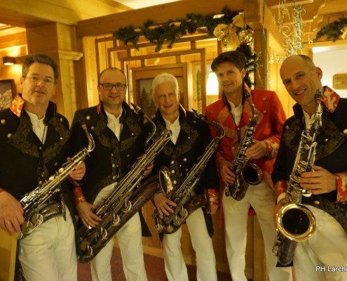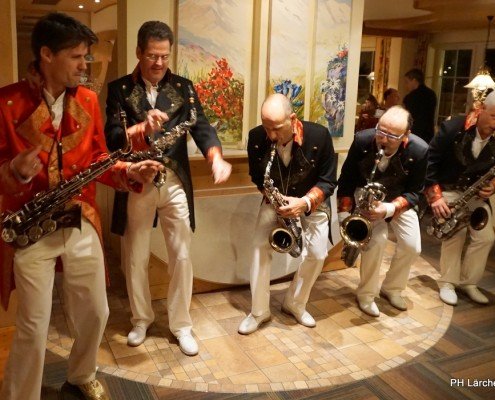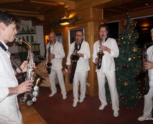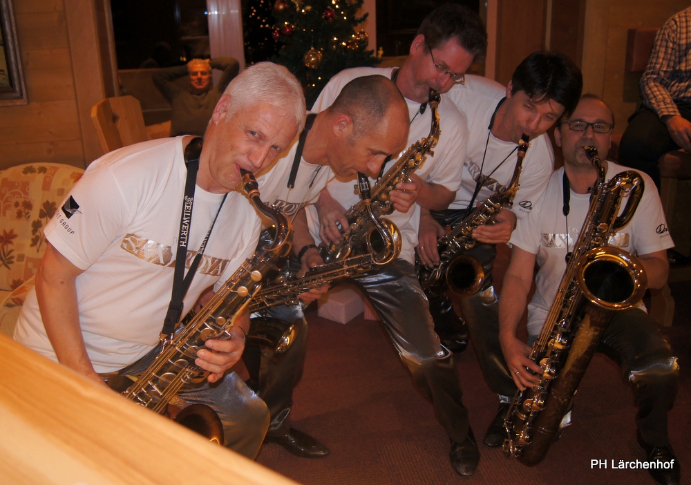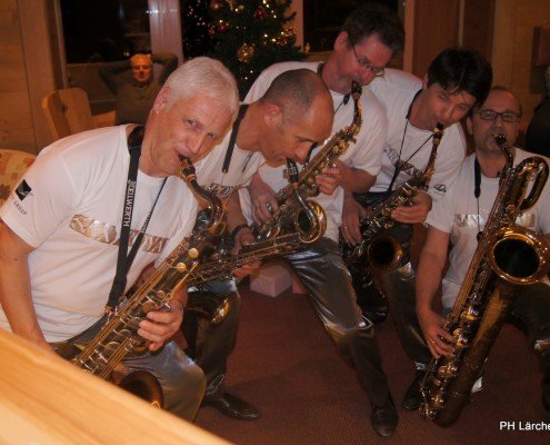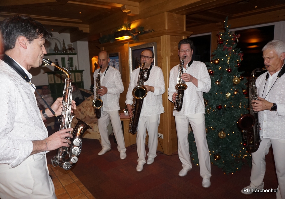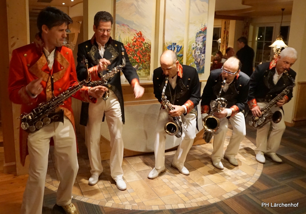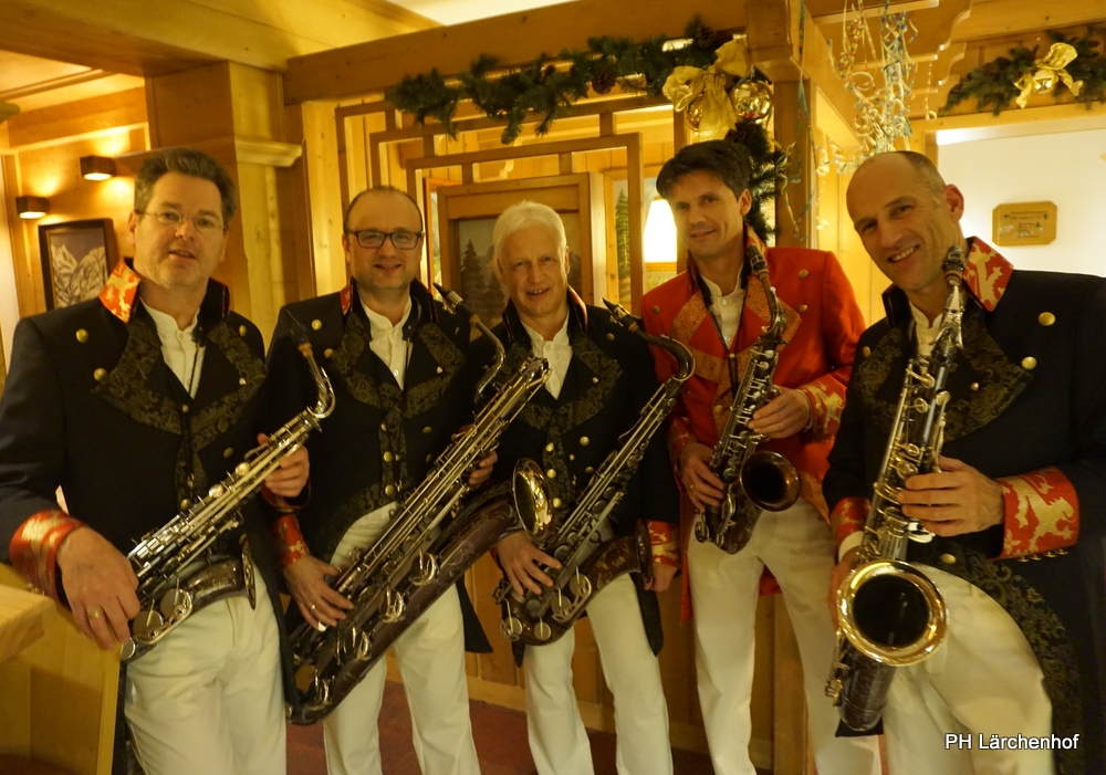 Beswingt ins Neue Jahr heisst es auch heuer wieder bei uns im Hotel Lärchenhof. Sax Royal – das nicht genormte Saxophon Ensemble, so die Eigenbezeichnung des Qunitetts, bietet zum Auftakt für 2017 die bewährt perfekte Untermalung zum 6-gängigen Neujahrs-Galadinner.